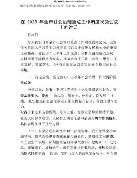 【七哥公文】2025年:【七哥公文】在2025年全市社会治理重点工作调度视频会议上的讲话+更多免费公文+VX:QiGeGongWen2024+更多免费公文+VX:QiGeGongWen2024