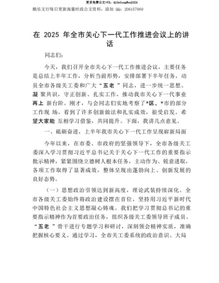 【七哥公文】2025年:【七哥公文】在2025年全市关心下一代工作推进会议上的讲话+更多免费公文+VX:QiGeGongWen2024+更多免费公文+VX:QiGeGongWen2024