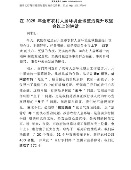 【七哥公文】2025年:【七哥公文】在2025年全市农村人居环境全域整治提升攻坚会议上的讲话+更多免费公文+VX:QiGeGongWen2024+更多免费公文+VX:QiGeGongWen2024