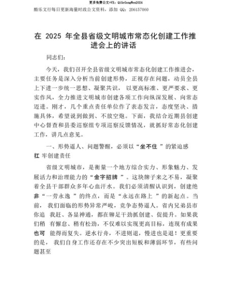 【七哥公文】2025年:【七哥公文】在2025年全县省级文明城市常态化创建工作推进会上的讲话+更多免费公文+VX:QiGeGongWen2024+更多免费公文+VX:QiGeGongWen2024