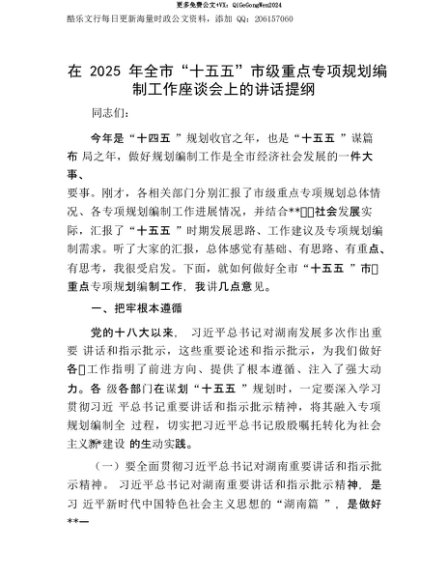 【七哥公文】2025年:【七哥公文】在2025年全市“十五五”市级重点专项规划编制工作座谈会上的讲话提纲+更多免费公文+VX:QiGeGongWen2024+更多免费公文+VX:QiGeGongWen2024