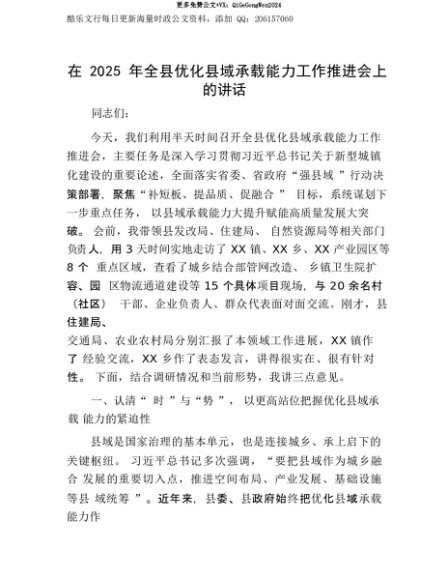【七哥公文】2025年:【七哥公文】在2025年全县优化县域承载能力工作推进会上的讲话+更多免费公文+VX:QiGeGongWen2024+更多免费公文+VX:QiGeGongWen2024