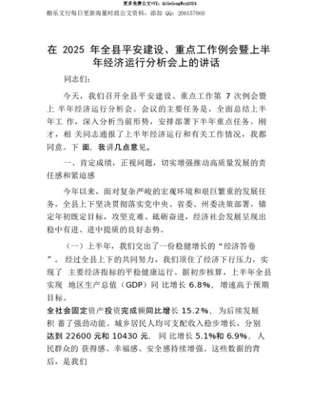 【七哥公文】2025年:【七哥公文】在2025年全县平安建设、重点工作例会暨上半年经济运行分析会上的讲话+更多免费公文+VX:QiGeGongWen2024+更多免费公文+VX:QiGeGongWen2024