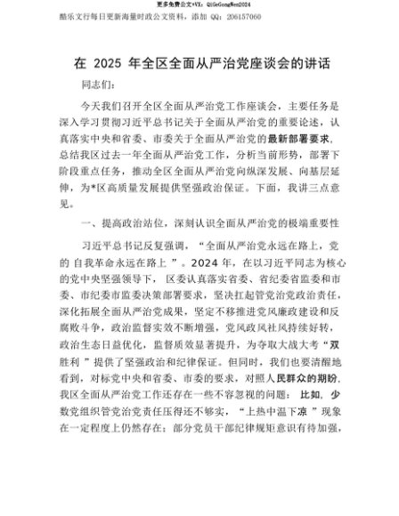 【七哥公文】2025年:【七哥公文】在2025年全区全面从严治X座谈会的讲话+更多免费公文+VX:QiGeGongWen2024+更多免费公文+VX:QiGeGongWen2024
