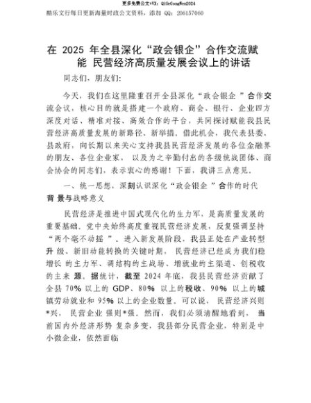 【七哥公文】2025年:【七哥公文】在2025年全县深化“政会银企”合作交流赋能民营经济高质量发展会议上的讲话+更多免费公文+VX:QiGeGongWen2024+更多免费公文+VX:QiGeGongWen2024