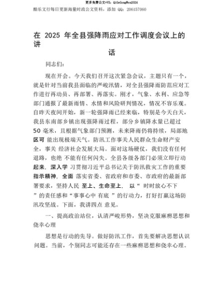 【七哥公文】2025年:【七哥公文】在2025年全县强降雨应对工作调度会议上的讲话+更多免费公文+VX:QiGeGongWen2024+更多免费公文+VX:QiGeGongWen2024