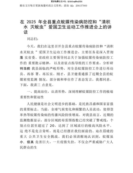 【七哥公文】2025年:【七哥公文】在2025年全县重点蚊媒传染病防控和“清积水灭蚊虫”爱国卫生运动工作推进会上的讲话+更多免费公文+VX:QiGeGongWen2024+更多免费公文+VX:QiGeGongWen2024