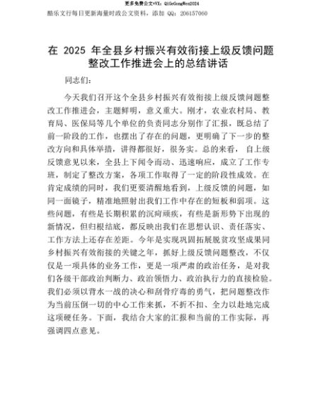 【七哥公文】2025年:【七哥公文】在2025年全县乡村振兴有效衔接上级反馈问题整改工作推进会上的总结讲话+更多免费公文+VX:QiGeGongWen2024+更多免费公文+VX:QiGeGongWen2024