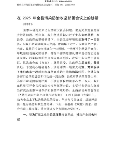 【七哥公文】2025年:【七哥公文】在2025年全县污染防治攻坚部署会议上的讲话+更多免费公文+VX:QiGeGongWen2024+更多免费公文+VX:QiGeGongWen2024