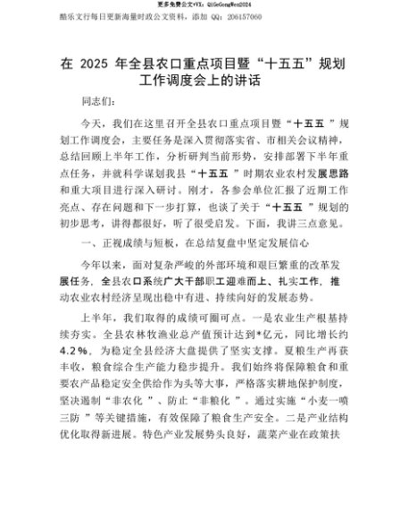 【七哥公文】2025年:【七哥公文】在2025年全县农口重点项目暨“十五五”规划工作调度会上的讲话+更多免费公文+VX:QiGeGongWen2024+更多免费公文+VX:QiGeGongWen2024