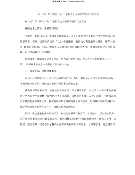 【七哥公文】2025年:【七哥公文】在2025年“两优一先”表彰大会上的优秀X员代表发言+更多免费公文+VX:QiGeGongWen2024+更多免费公文+VX:QiGeGongWen2024