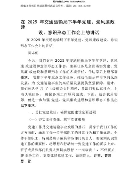 【七哥公文】2025年:【七哥公文】在2025年交通运输局下半年X建、X风廉政建设、意识形态工作会上的讲话+更多免费公文+VX:QiGeGongWen2024+更多免费公文+VX:QiGeGongWen2024