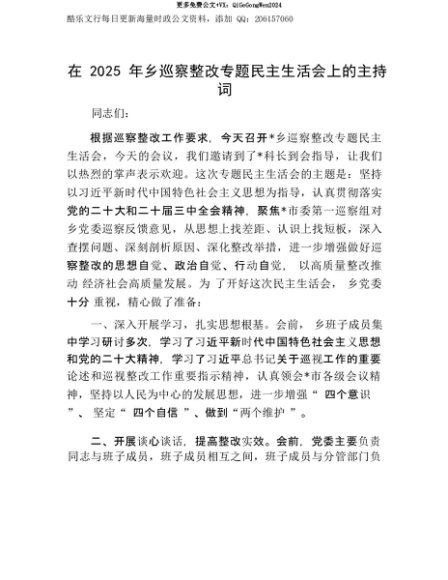 【七哥公文】2025年:【七哥公文】在2025年乡巡察整改专题民主生活会上的主持词+更多免费公文+VX:QiGeGongWen2024+更多免费公文+VX:QiGeGongWen2024
