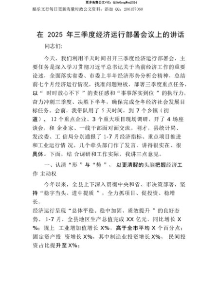 【七哥公文】2025年:【七哥公文】在2025年三季度经济运行部署会议上的讲话+更多免费公文+VX:QiGeGongWen2024+更多免费公文+VX:QiGeGongWen2024