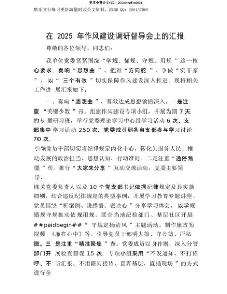 【七哥公文】2025年:【七哥公文】在2025年作风建设调研督导会上的汇报+更多免费公文+VX:QiGeGongWen2024+更多免费公文+VX:QiGeGongWen2024