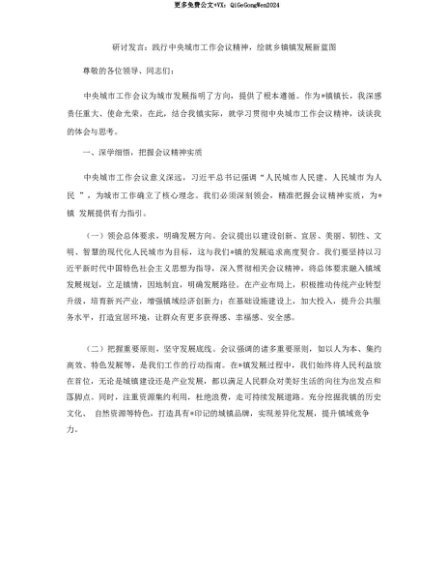 【七哥公文】2025年:【七哥公文】研讨发言:践行中央城市工作会议精神,绘就乡镇镇发展新蓝图+更多免费公文+VX:QiGeGongWen2024+更多免费公文+VX:QiGeGongWen2024