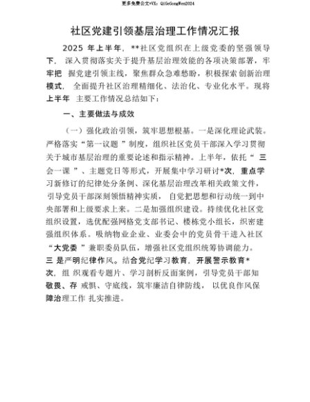 【七哥公文】2025年:【七哥公文】社区X建引领基层治理工作情况汇报+更多免费公文+VX:QiGeGongWen2024+更多免费公文+VX:QiGeGongWen2024