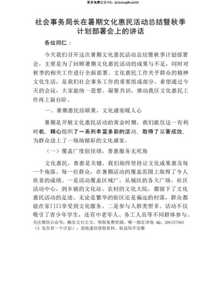 【七哥公文】2025年:【七哥公文】社会事务局长在暑期文化惠民活动总结暨秋季计划部署会上的讲话+更多免费公文+VX:QiGeGongWen2024+更多免费公文+VX:QiGeGongWen2024