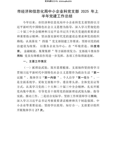 【七哥公文】2025年:【七哥公文】市经济和信息化局中小企业科X支部2025年上半年X建工作总结+更多免费公文+VX:QiGeGongWen2024+更多免费公文+VX:QiGeGongWen2024