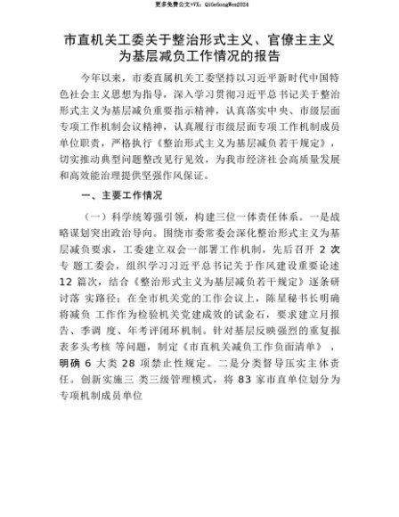 【七哥公文】2025年:【七哥公文】市直机关工委关于整治形式主义、官僚主主义为基层减负工作情况的报告+更多免费公文+VX:QiGeGongWen2024+更多免费公文+VX:QiGeGongWen2024
