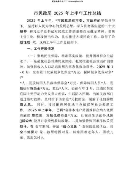 【七哥公文】2025年:【七哥公文】市民政局2025年上半年工作总结+更多免费公文+VX:QiGeGongWen2024+更多免费公文+VX:QiGeGongWen2024