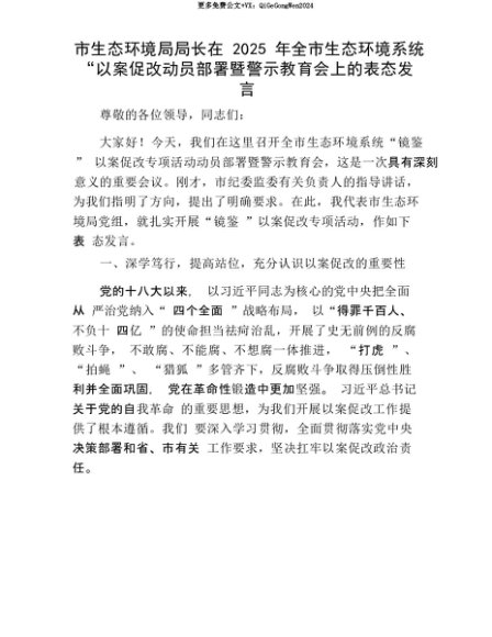 【七哥公文】2025年:【七哥公文】市生态环境局局长在2025年全市生态环境系统“以案促改动员部署暨警示教育会上的表态发言+更多免费公文+VX:QiGeGongWen2024+更多免费公文+VX:QiGeGongWen2024
