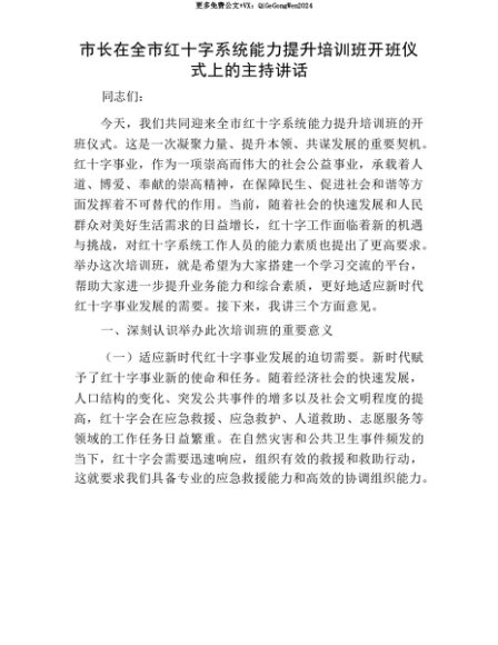 【七哥公文】2025年:【七哥公文】市长在全市红十字系统能力提升培训班开班仪式上的主持讲话+更多免费公文+VX:QiGeGongWen2024+更多免费公文+VX:QiGeGongWen2024
