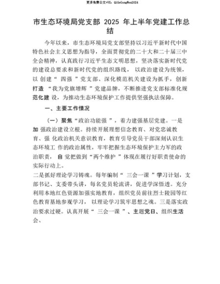 【七哥公文】2025年:【七哥公文】市生态环境局X支部2025年上半年X建工作总结+更多免费公文+VX:QiGeGongWen2024+更多免费公文+VX:QiGeGongWen2024