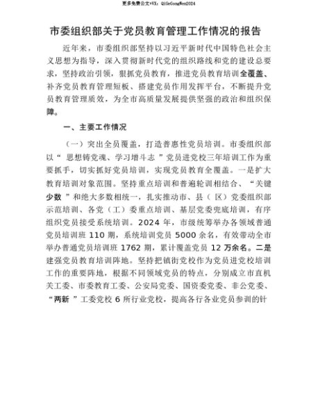 【七哥公文】2025年:【七哥公文】市委组织部关于X员教育管理工作情况的报告+更多免费公文+VX:QiGeGongWen2024+更多免费公文+VX:QiGeGongWen2024