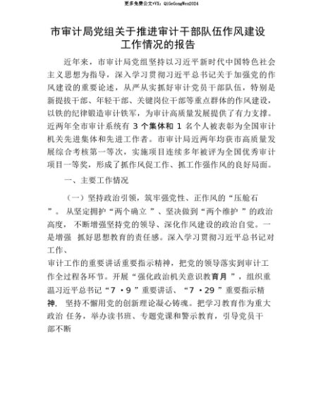 【七哥公文】2025年:【七哥公文】市审计局X组关于推进审计干部队伍作风建设工作情况的报告+更多免费公文+VX:QiGeGongWen2024+更多免费公文+VX:QiGeGongWen2024