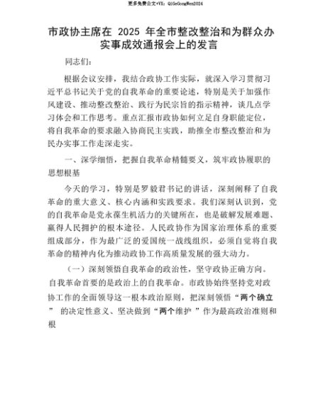 【七哥公文】2025年:【七哥公文】市政协主席在2025年全市整改整治和为群众办实事成效通报会上的发言+更多免费公文+VX:QiGeGongWen2024+更多免费公文+VX:QiGeGongWen2024