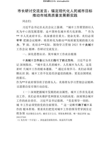 【七哥公文】2025年:【七哥公文】市长研讨交流发言:锚定现代化人民城市目标 推动市域高质量发展新实践+更多免费公文+VX:QiGeGongWen2024+更多免费公文+VX:QiGeGongWen2024