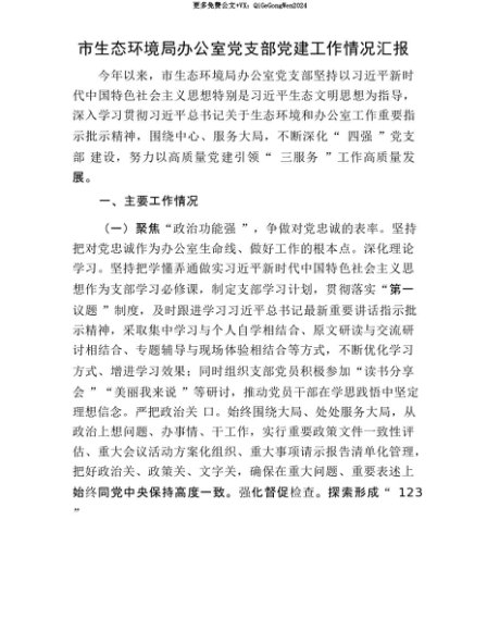 【七哥公文】2025年:【七哥公文】市生态环境局办公室X支部X建工作情况汇报+更多免费公文+VX:QiGeGongWen2024+更多免费公文+VX:QiGeGongWen2024