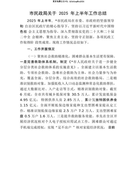 【七哥公文】2025年:【七哥公文】市民政局关于2025年上半年工作总结+更多免费公文+VX:QiGeGongWen2024+更多免费公文+VX:QiGeGongWen2024