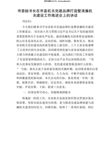【七哥公文】2025年:【七哥公文】市委秘书长在市直机关X建品牌打造暨清廉机关建设工作推进会上的讲话+更多免费公文+VX:QiGeGongWen2024+更多免费公文+VX:QiGeGongWen2024