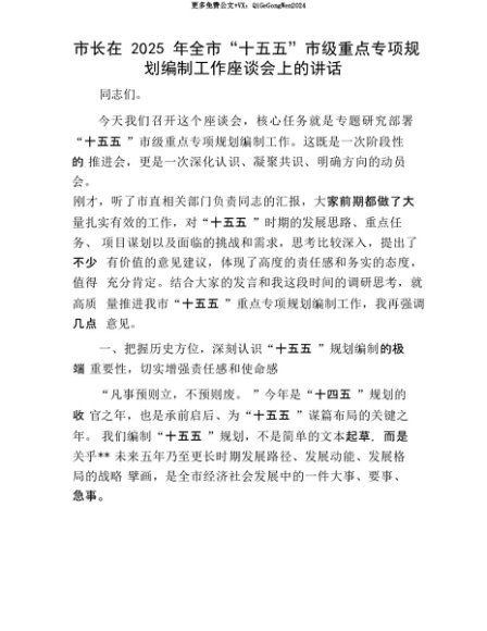 【七哥公文】2025年:【七哥公文】市长在2025年全市“十五五”市级重点专项规划编制工作座谈会上的讲话+更多免费公文+VX:QiGeGongWen2024+更多免费公文+VX:QiGeGongWen2024