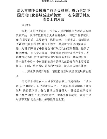 【七哥公文】2025年:【七哥公文】深入贯彻中央城市工作会议精神,奋力书写中国式现代化县域城建新篇章——在专题研讨交流会上的发言+更多免费公文+VX:QiGeGongWen2024+更多免费公文+VX:QiGeGongWen2024