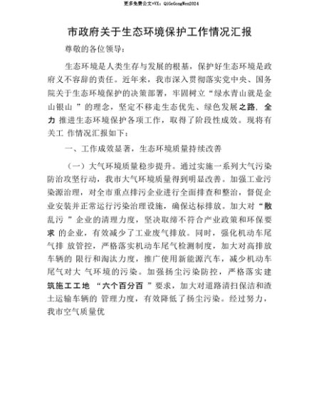 【七哥公文】2025年:【七哥公文】市政府关于生态环境保护工作情况汇报+更多免费公文+VX:QiGeGongWen2024+更多免费公文+VX:QiGeGongWen2024
