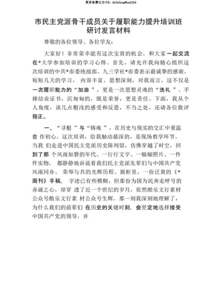 【七哥公文】2025年:【七哥公文】市民主X派骨干成员关于履职能力提升培训班研讨发言材料+更多免费公文+VX:QiGeGongWen2024+更多免费公文+VX:QiGeGongWen2024