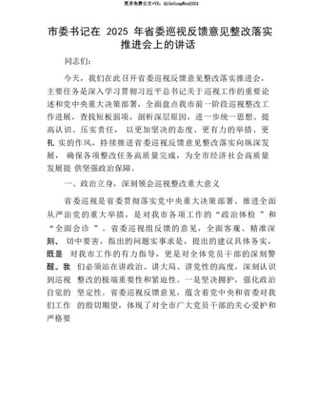 【七哥公文】2025年:【七哥公文】市委书记在2025年省委巡视反馈意见整改落实推进会上的讲话+更多免费公文+VX:QiGeGongWen2024+更多免费公文+VX:QiGeGongWen2024