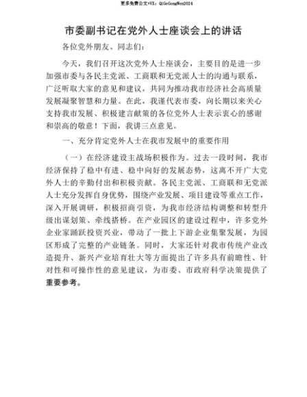 【七哥公文】2025年:【七哥公文】市委副书记在X外人士座谈会上的讲话+更多免费公文+VX:QiGeGongWen2024+更多免费公文+VX:QiGeGongWen2024