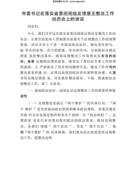 【七哥公文】2025年:【七哥公文】市委书记在落实省委巡视组反馈意见整改工作动员会上的讲话+更多免费公文+VX:QiGeGongWen2024+更多免费公文+VX:QiGeGongWen2024