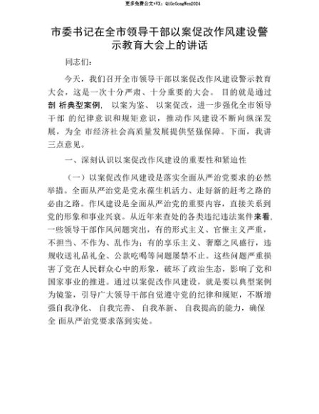 【七哥公文】2025年:【七哥公文】市委书记在全市领导干部以案促改作风建设警示教育大会上的讲话+更多免费公文+VX:QiGeGongWen2024+更多免费公文+VX:QiGeGongWen2024