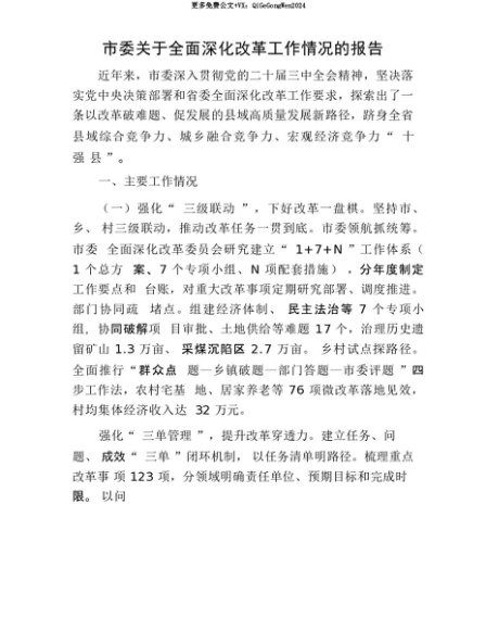 【七哥公文】2025年:【七哥公文】市委关于全面深化改革工作情况的报告+更多免费公文+VX:QiGeGongWen2024+更多免费公文+VX:QiGeGongWen2024