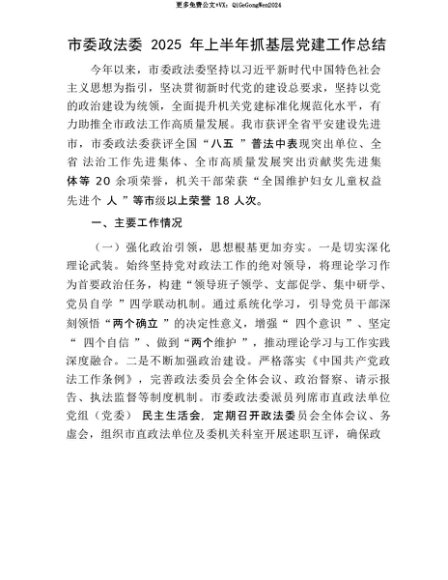 【七哥公文】2025年:【七哥公文】市委政法委2025年上半年抓基层X建工作总结+更多免费公文+VX:QiGeGongWen2024+更多免费公文+VX:QiGeGongWen2024