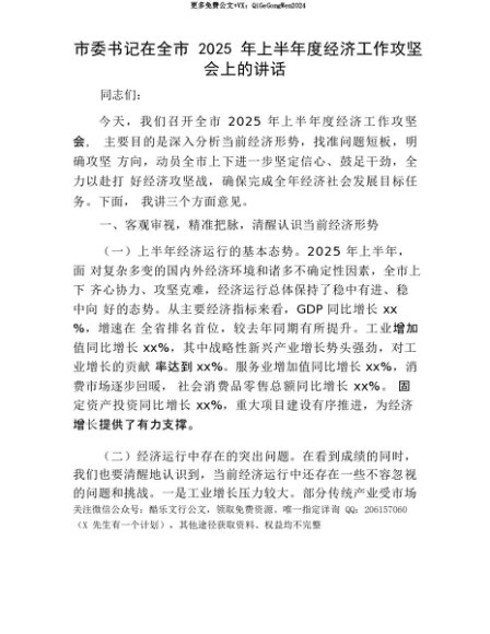 【七哥公文】2025年:【七哥公文】市委书记在全市2025年上半年度经济工作攻坚会上的讲话+更多免费公文+VX:QiGeGongWen2024+更多免费公文+VX:QiGeGongWen2024