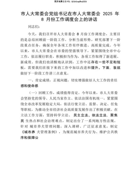 【七哥公文】2025年:【七哥公文】市人大常委会X组书记在市人大常委会2025年8月份工作调度会上的讲话+更多免费公文+VX:QiGeGongWen2024+更多免费公文+VX:QiGeGongWen2024
