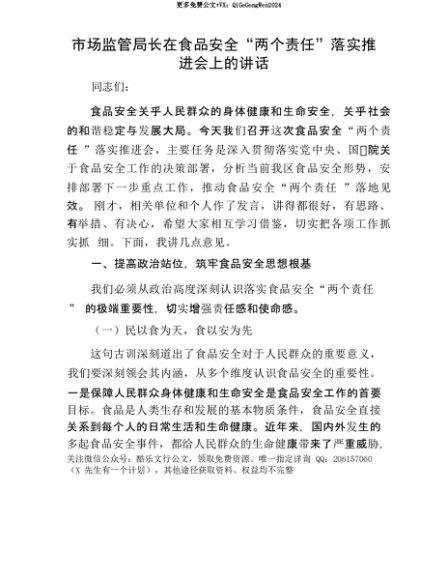 【七哥公文】2025年:【七哥公文】市场监管局长在食品安全“两个责任”落实推进会上的讲话+更多免费公文+VX:QiGeGongWen2024+更多免费公文+VX:QiGeGongWen2024