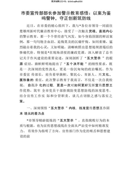 【七哥公文】2025年:【七哥公文】市委宣传部部长参加警示教育感悟:以案为鉴鸣警钟,守正创新筑防线+更多免费公文+VX:QiGeGongWen2024+更多免费公文+VX:QiGeGongWen2024