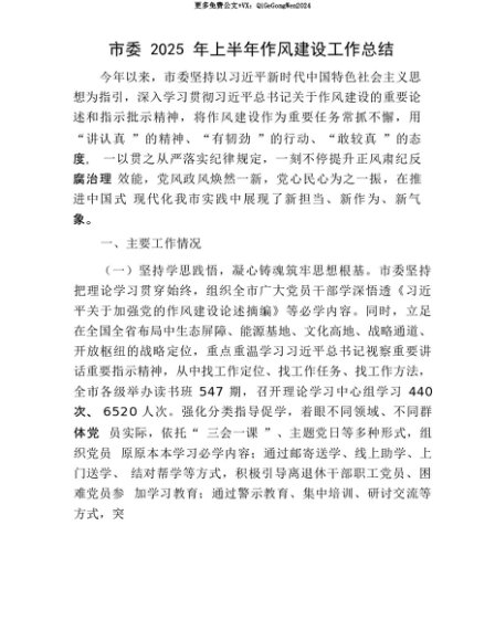 【七哥公文】2025年:【七哥公文】市委2025年上半年作风建设工作总结+更多免费公文+VX:QiGeGongWen2024+更多免费公文+VX:QiGeGongWen2024